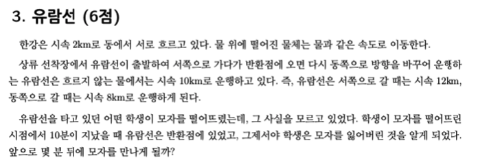 모자를 떨어뜨리고 한시간이 지났다고 해보겠습니다. 즉 12km를 이동해 온 것입니다. 모자역시 원래 위치에서 2km이동합니다. 이제 배가 한시간을 거슬러 올라가면 8km 를 이동합니다. 모자역시 배가 이동하는 한시간 동안 2km를 더 이동합니다. 결국 이동한 시간만큼 거슬러 올라가면 모자를 만날 수 있습니다.