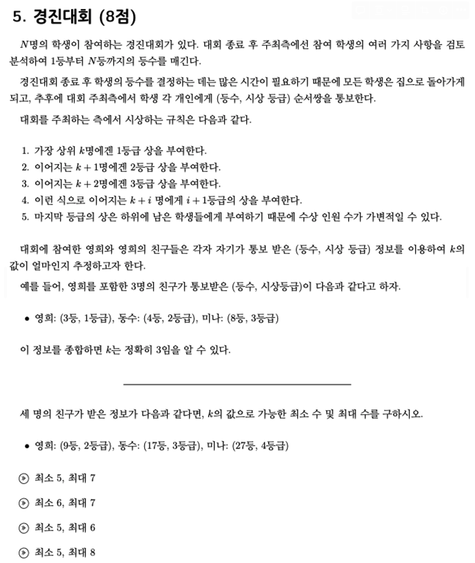 그럼 최소값을 5명으로 생각해 보겠습니다. 1등급이 5명으로 5등, 2등급이 6명으로 11등까지 가능합니다. 3등급은 7명으로 18등까지 가능합니다. 마지막으로 4등급은 8명으로 26등까지 입니다. 미나가 4등급이 될 수 없기 때문에 최소값을 6으로 시도해 봅니다.