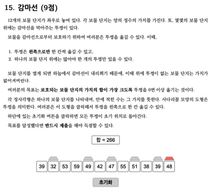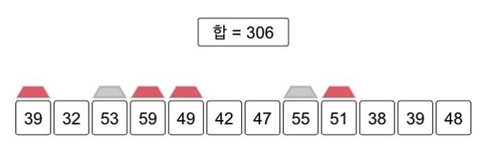 맨 앞에 있는 뚜껑은 오른쪽에 있는 큰 숫자들로 이동할 수 없습니다. 하지만 왼쪽으로 이동한다면 32보다 7 큰 39로 이동이 가능합니다. 맨 앞의 뚜껑을 39로 이동하면 합이 306이 됩니다.