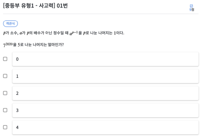 페르마의 소정리를 몰라도 a^(p-1) 을 p로 나눈 나머지가 1이라는 사실을 알려주었기 때문에 이를 이용해서 문제를 풀 수 있습니다. 7^(4 * 505) 를 5로 나눈 나머지는 결국 1이라는 것을 알 수 있습니다.