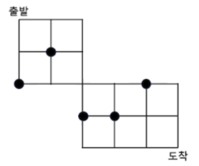 왼쪽 상단에 두 점 모두 지나는 방법은 없습니다. 한 점을 지나는 경로를 모두 찾습니다. 모두 찾아보면 총 5개의 경로를 찾을 수 있습니다.