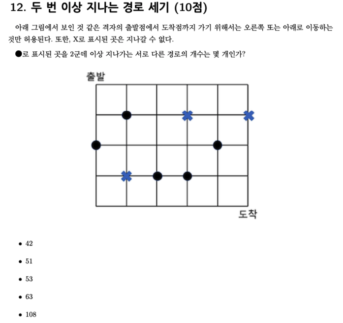 파란색 선을 지나서 아래쪽 빨간점 두개를 모두 지나는 경로도 고려해 주어야 합니다. 상단에서 점을 지나지 않고 내려오는 경로는 한가지 밖에 없습니다. 그리고 하단에서 두 점을 모두 지나는 경로는 3가지가 있습니다.
