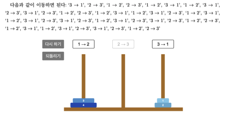 하노이의 탑을 이해하면 문제를 쉽게 해결할 수 있습니다. 까다로운 점은 하노이의 탑 문제와는 약간 다르게 1번은 2번으로, 2번은 3번으로, 3번은 1번 막대로만 이동한다는 제약이 있습니다. 이는 조금 귀찮은 부분이지만 어려운 부분은 아닙니다. 따라서 몇 번 되돌리며 이동을 잘 시키면 아래와 같은 결론을 얻을 수 있습니다.