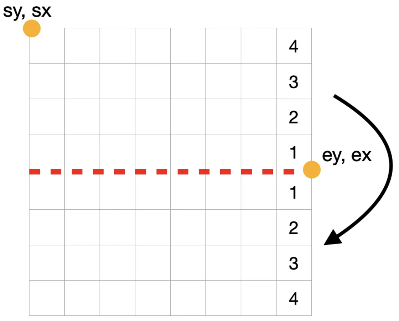 상단으로 접는 U의 경우 시작 좌표는 그대로 이지만 끝 좌표는 반으로 접혀있기 때문에 y의 값이 시작 y와 끝 y의 중간이 됩니다. 그래서 ey의 값은 (sy + ey) // 2 가 됩니다.