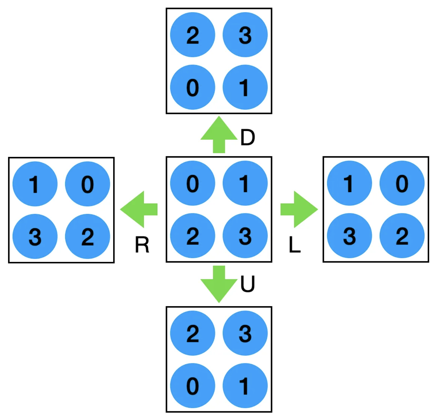 가운데 뚫은 구멍 h의 값 0, 1, 2, 3의 위치가 U, D, L, R에 따라 원래의 위치로 돌아갔을 때 어떤 숫자가 되는지 나타낸 것입니다. 접은 것을 펼치기 때문에 아래로 접는 방법인 D가 위에 표시되어 있고, 왼쪽으로 접는 방법 L이 오른쪽에 표시된 것입니다. 그럼 접은 것을 펼쳤을 때 구멍의 위치는 다음과 같이 나타낼 수 있습니다.