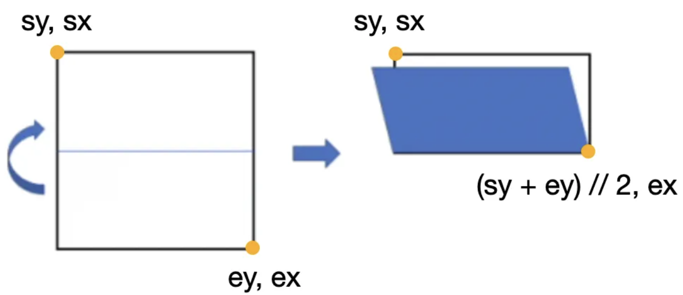 상단으로 접는 U의 경우 시작 좌표는 그대로 이지만 끝 좌표는 반으로 접혀있기 때문에 y의 값이 시작 y와 끝 y의 중간이 됩니다. 그래서 ey의 값은 (sy + ey) // 2 가 됩니다.