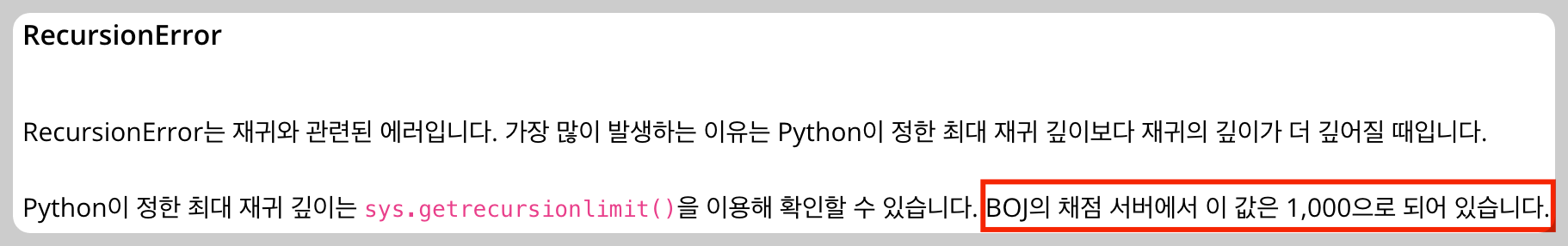 DFS, 다이나믹 프로그래밍등을 재귀로 구현했다면 파이썬이 정한 최대 깊이로는 에러가 발생할수 밖에 없습니다. 따라서 이 문제는 재귀함수가 많이 호출될 거라는 것을 알려주어야 RecursionError가 발생하지 않습니다.