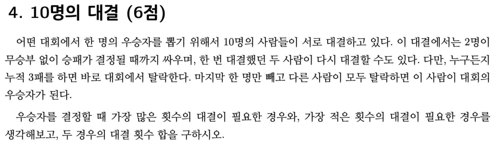 먼저 가장 적은 횟수의 대결부터 생각해 보겠습니다. 가장 적은 횟수가 되기 위해서는 이긴사람은 계속 연승으로 이기고, 최종 승자는 한 번도 지지않고 계속 이기면 됩니다. 10명이 5팀으로 나누어 3번씩 대결을 하면 3 * 5 = 15로 15번의 경기만에 5명으로 줄게 됩니다.