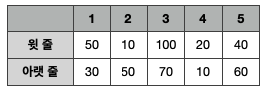 두 번째 열 아무것도 뜯지 않았다면 첫 번째 열의 최대 점수인 50이 얻을 수 있는 최대 점수 입니다. 윗 줄을 뜯는 다면 첫 번째 열의 윗 줄을 뜯을 수 없습니다.