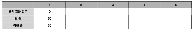 각각 아무것도 뜯지 않은 경우에는 0, 윗 줄을 뜯은 경우 50, 아랫 줄을 뜯은 경우 30의 점수를 얻게 됩니다. 다음으로 두 번째 열을 생각해 보겠습니다.