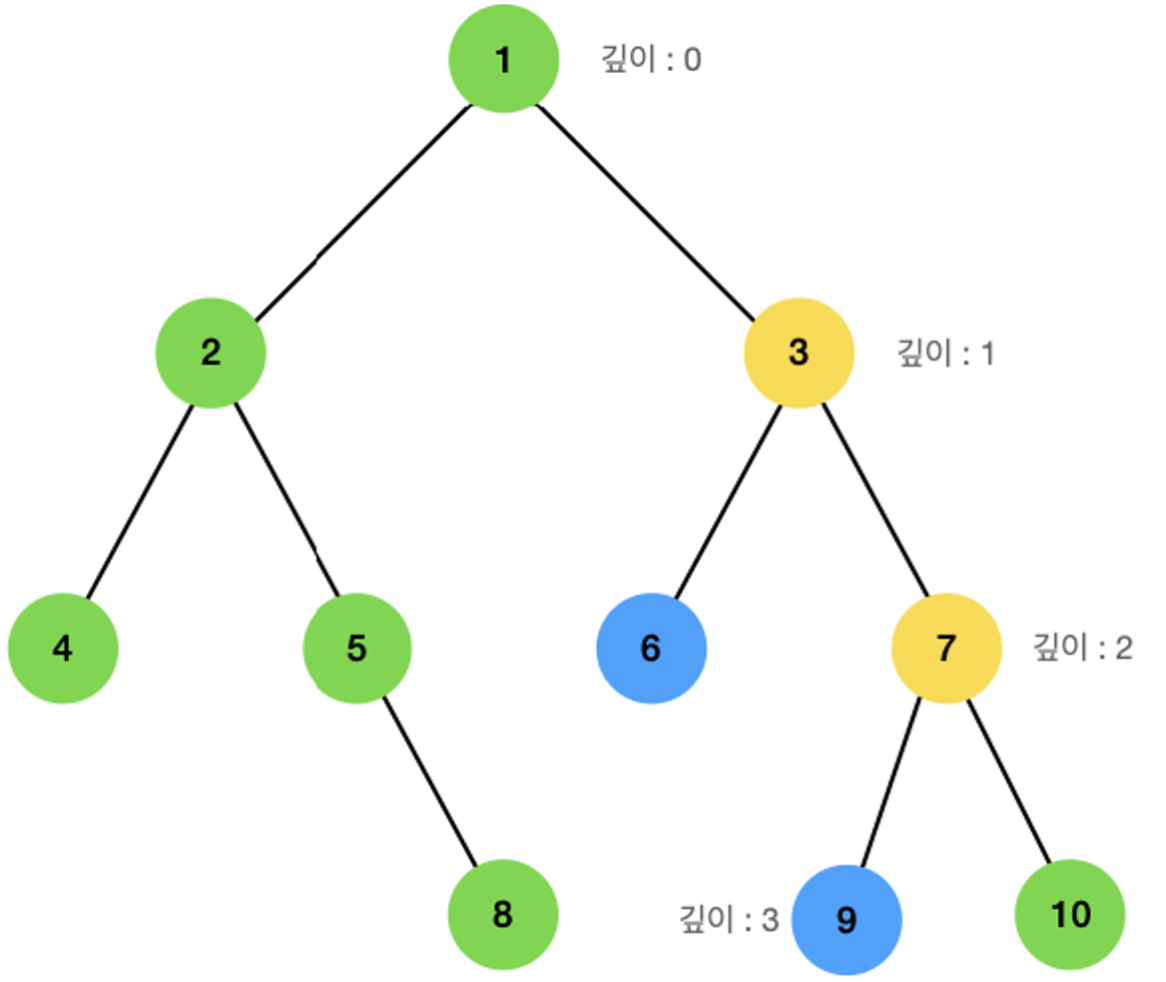 3의 부모는 1이고 7의 부모는 3 입니다. 아직 공통 조상이 없기 때문에 계속 위를 찾게 됩니다. 최소 공통 조상이 3이지만 그냥 위로 타고 올라가기만 한다면 최소 공통 조상을 지나치게 될 수 있습니다. 이는 정점들의 깊이를 고려하지 않았기 때문입니다. 두 정점이 같은 높이에서 한 칸씩 위로 올라가야 공통 조상을 찾을 수 있습니다.