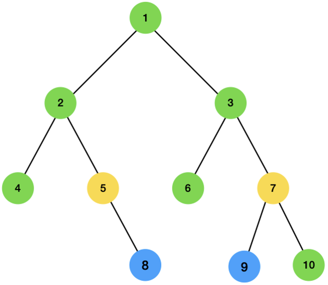 8번과 9번의 최소 공통 조상을 찾는다고 해보겠습니다. 두 정점의 부모를 찾아 올라갑니다. 먼저 8의 부모인 5와 9의 부모 7이 됩니다.
