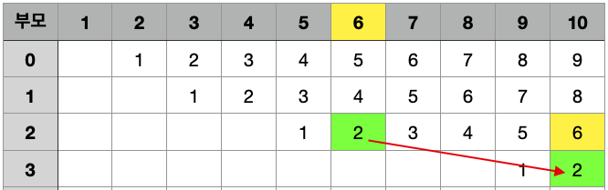 같은 방식으로 8 차이 나는 부모는 4차이 나는 부모의 4 차이 나는 부모가 됩니다. 10의 4 차이 나는 부모인 6의 4 차이나는 부모인 2를 찾아주면 됩니다.
