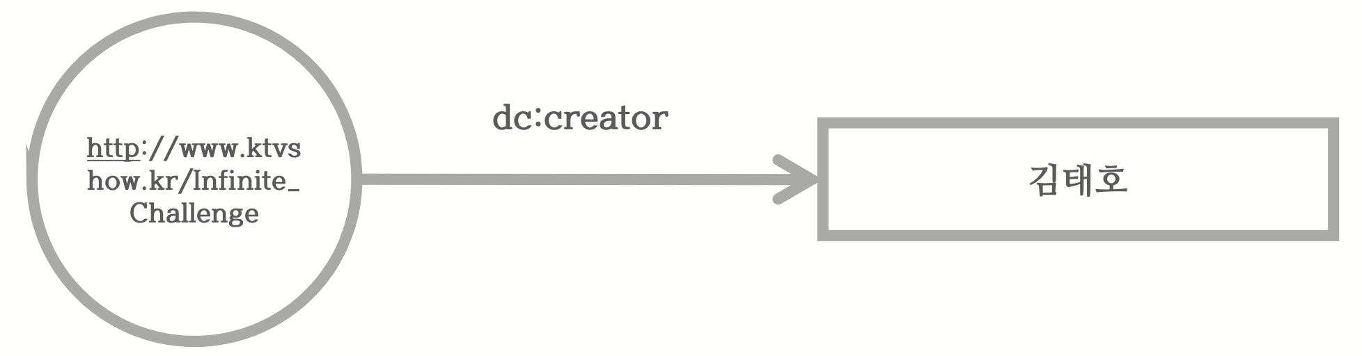 이와 같이 SPO 단계로 구성한다고 해서 기계가 쉽게 알아듣는 것은 아닙니다. 좀 더 이해하기 쉽게 만들기 위해 URI(Uniform Resource Identifier)를 사용합니다. 무한도전, 제작자, 김태호등을 웹상에서 사용할 하나의 개체로 표현해 줍니다. 그럼 위의 관계가 아래와 같이 표현할 수 있습니다.