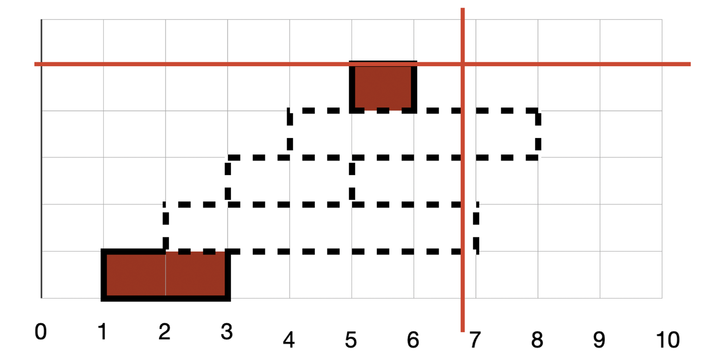 모든 고기들을 탐색 하면서 꼬치에 꽂히는 고기를 찾습니다. x 꼬치는 시작 s가 x보다 작은 모든 꼬치에 꽂힙니다. 이 때 x가 3이라면 3이 포함된 꼬치도 꽂히기 때문에 s ≤ x 가 됩니다. 다음으로 끝 위치는 3이 포함되지 않기 때문에 x < e가 됩니다. y값 역시 똑같은 방법으로 꼬치에 꽂힌 항목을 찾습니다.