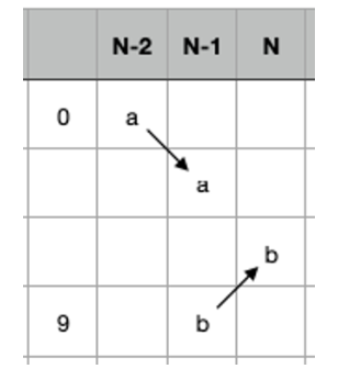 이 그림과 같이 N - 1 번째 a의 경우의 수와 b의 경우의 수의 합인 N번째 a + b가 N번째로 끝나는 수의 경우의 수가 되는 것입니다. 이렇게 경우의 수를 위와 아래에서 더해주면 되지만 마지막 값이 0이거나 9일 경우에는 아래와 같이 한가지 경우만 가능합니다.
