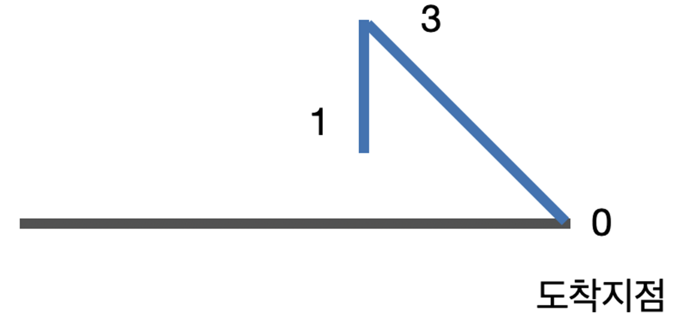 마찬가지로 마지막에서 두 번째 지점은 속력이 2 이상이 될 수 없습니다. 그래야 마지막 지점에서 속력이 1이 될 수 있고, 도착지점에서는 0이 될 수 있기 때문 입니다.