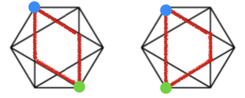 위와 같은 경우는 원순열 입장에서는 분명 다른 순열입니다. 왼쪽의 1번 입장에서 왼쪽이 2번이였는데 오른쪽에서는 오른쪽이 2번 입니다. 그러니 다르지만 이것이 목걸이의 배치라면 뒤집는 순간 두 경우는 같은 것입니다. 이것을 염주순열이라고 하고, 이 문제에서는 뒤집는 경우가 없다고 했으므로 염주순열인지 아닌지 고민할 필요가 없어진 것입니다.