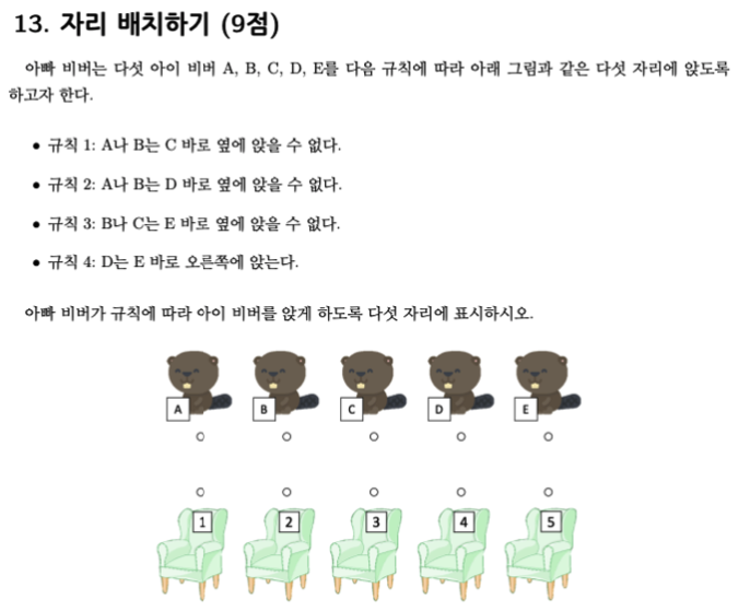 다음으로 규칙3을 보면 B, C는 E의 바로 옆에 앉을 수 없습니다. 이미 E의 오른쪽은 D 이기 때문에 남은 A가 E의 왼쪽이 됩니다.
