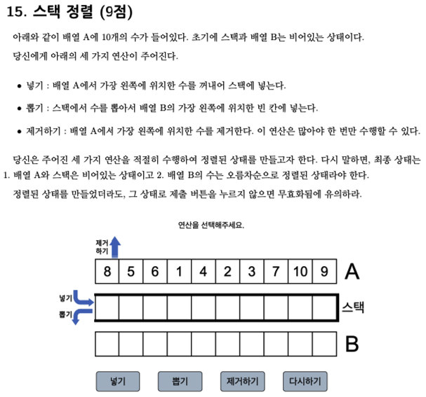 넣기를 통해 스택에 넣고, 뽑기를 통해 정렬을 해야 합니다. 문제는 제거하기를 통해 잘못된 배열을 바로잡아야 합니다. 정렬을 하기 위해서는 스택에 이전 숫자보다 작아지는 숫자를 넣어야 합니다. 그리고 뽑기를 할 때에는 커지는 순서대로 꺼내야 합니다.