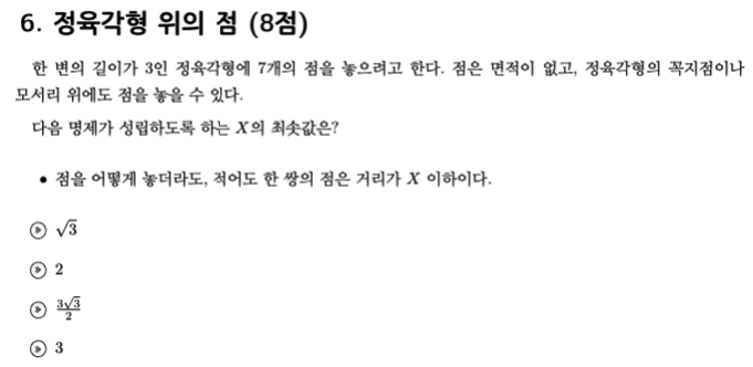 비둘기집 원리에 의해 두 점을 멀리 떨어뜨려 놓아도 나머지 점들과 가까워지기 때문에 적어도 한 쌍의 점은 한 변의 길이인 3이상 떨어지게 만들 수 없습니다.