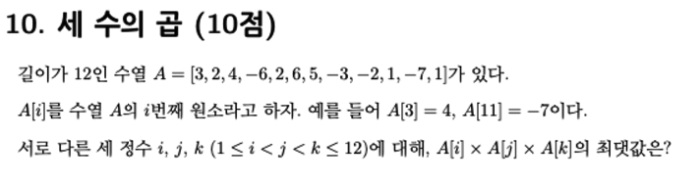 세 수의 곱이 최대가 되기 위해서는 양수 3개를 곱하던가, 음수 2개, 양수 1개를 곱하면 됩니다. 절대값이 큰 두 음수가 있다면 양수 3개를 곱하는 것보다 크게 만들 수 있습니다.