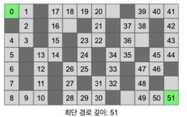최단 거리를 51로 만들기 쉽지 않습니다. 최대한 돌아가야 길이가 늘어나는데 가로, 세로 모두 홀수라 일자로 늘리면 원하는 모양이 나오지 않습니다. 길이를 맞추기 위해 중간중간 길이를 늘려야 51 이상의 거리를 만들 수 있습니다. 대각선 아래는 정답의 예 입니다.