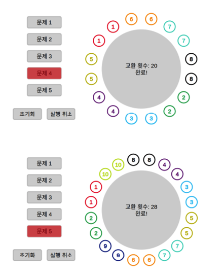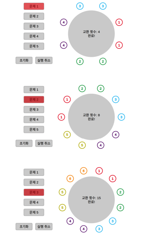 어느쪽으로 교환을 하는 것이 좋을지 따져보며 문제를 해결합니다. 여러번 테스트를 해가며 횟수를 줄이는 문제로 따로 겹치는 번호 때문에 인접하게 만들기 힘들다면 과감히 한쪽으로 몰아주는 것이 더 빠릅니다. 교환 횟수가 맞다면 모양은 아래와 같지 않아도 됩니다.